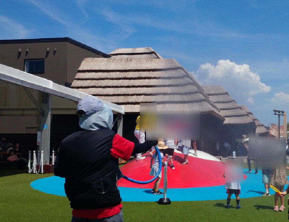 暑い日だからか、子どもが遊んでいる場所にスタッフさんが水をかけていました。